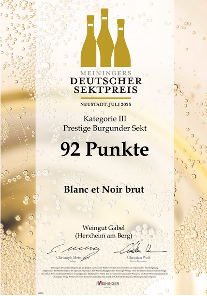 Bei der Verkostung zu Meiningers Deutscher Sektpreis wurde unser Blanc de Blanc brut nature mit 92 Punkten ausgezeichnet.