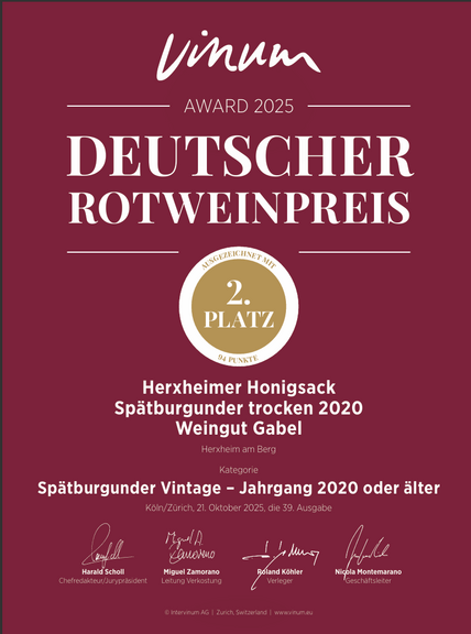 2. Platz für unseren 2020er Honigsack Spätburgunder in der Kategorie Spätburgunder Vintage!